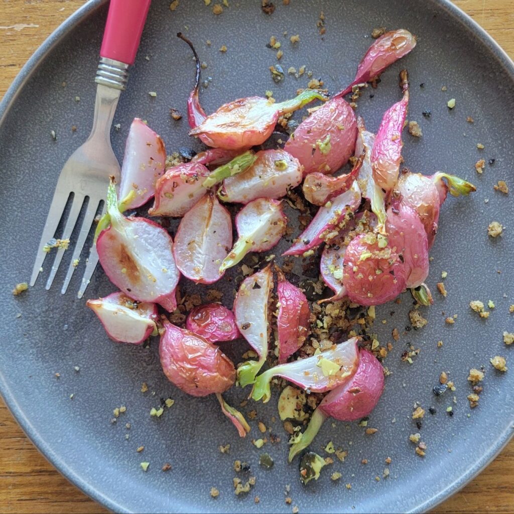 We had a very radish-ful start to the season, but hopefully you all have had a long enough break to enjoy these. French breakfast radishes are my favorite variety, and my preferred way to eat them is the french way —raw with a healthy smear of butter. But if you don’t like the spiciness of radish or are trying to figure out a way to get through them quick, roast them! Roasted radish are simple, delicious, and a lot easier to eat a bowl of in a single sitting.
