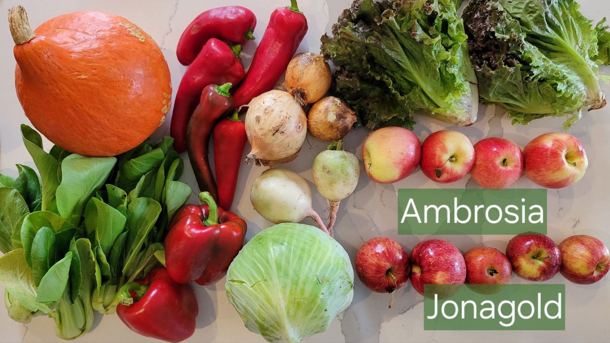 There’s lots of tasty stuff in the shares this week, particularly a lot of apples. We like to keep our apples in the crisper box of the refrigerator in their brown paper bags. Like that, they’ll keep for months. Knowing that we can stockpile apples for winter makes the amount we’ll get through the end of the season less daunting.